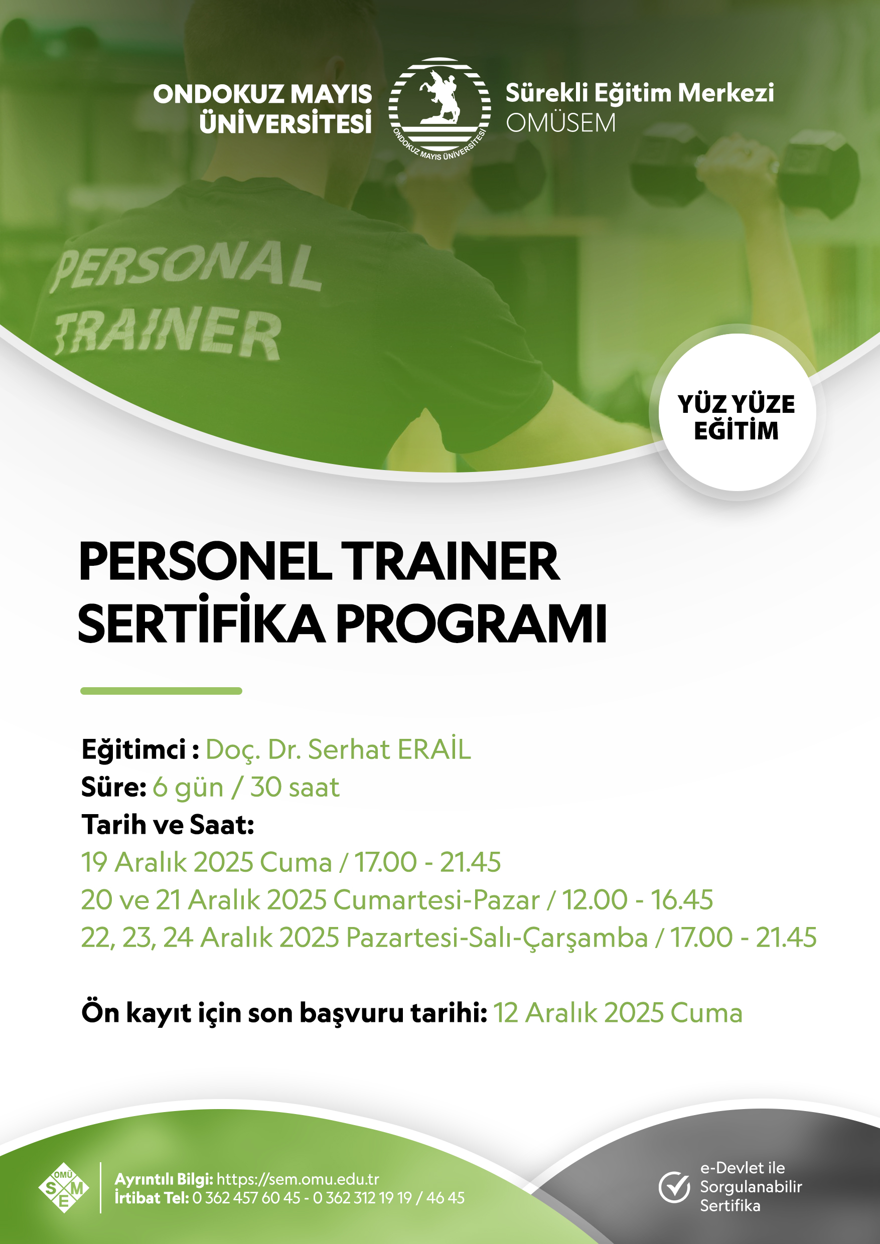 Program ile ilgili detaylı bilgiye ve başvuru formuna https://sem.omu.edu.tr/personal-trainer-sertifika-programi/ linki tıklayarak ulaşabilirsiniz.