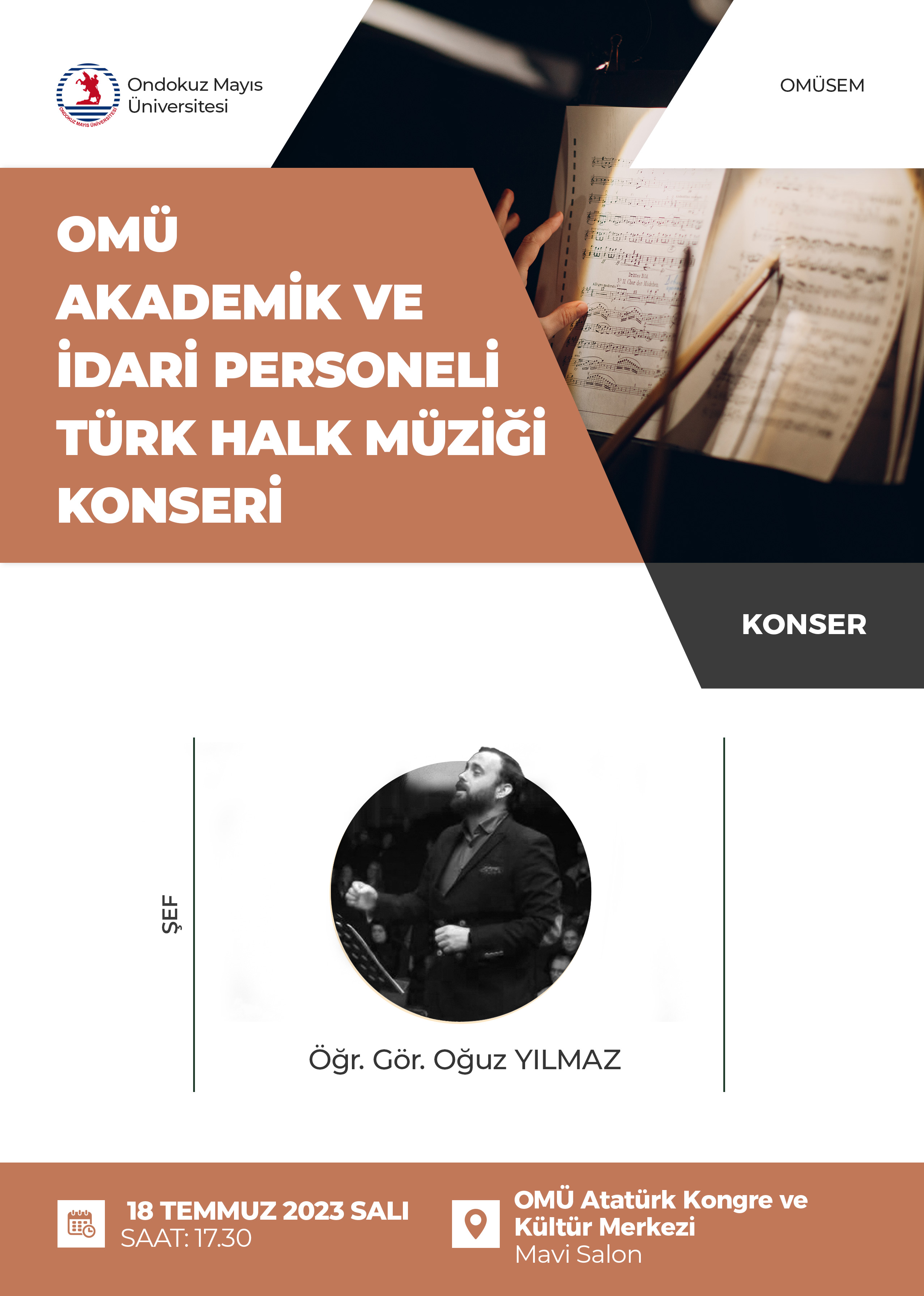 Sürekli Eğitim Merkezi (OMÜSEM) tarafından düzenlenen “OMÜ Akademik ve İdari Personeli İçin Türk Halk Müziği Koro Çalışmaları" nın çıktısı olarak 18 Temmuz 2023 Salı günü saat 17:30'da Atatürk Kongre ve Kültür Merkezi Mavi Salon'da gerçekleştirilecek olan "TÜRK HALK MÜZİĞİ KONSERİ"ne teşriflerinizi dileriz.