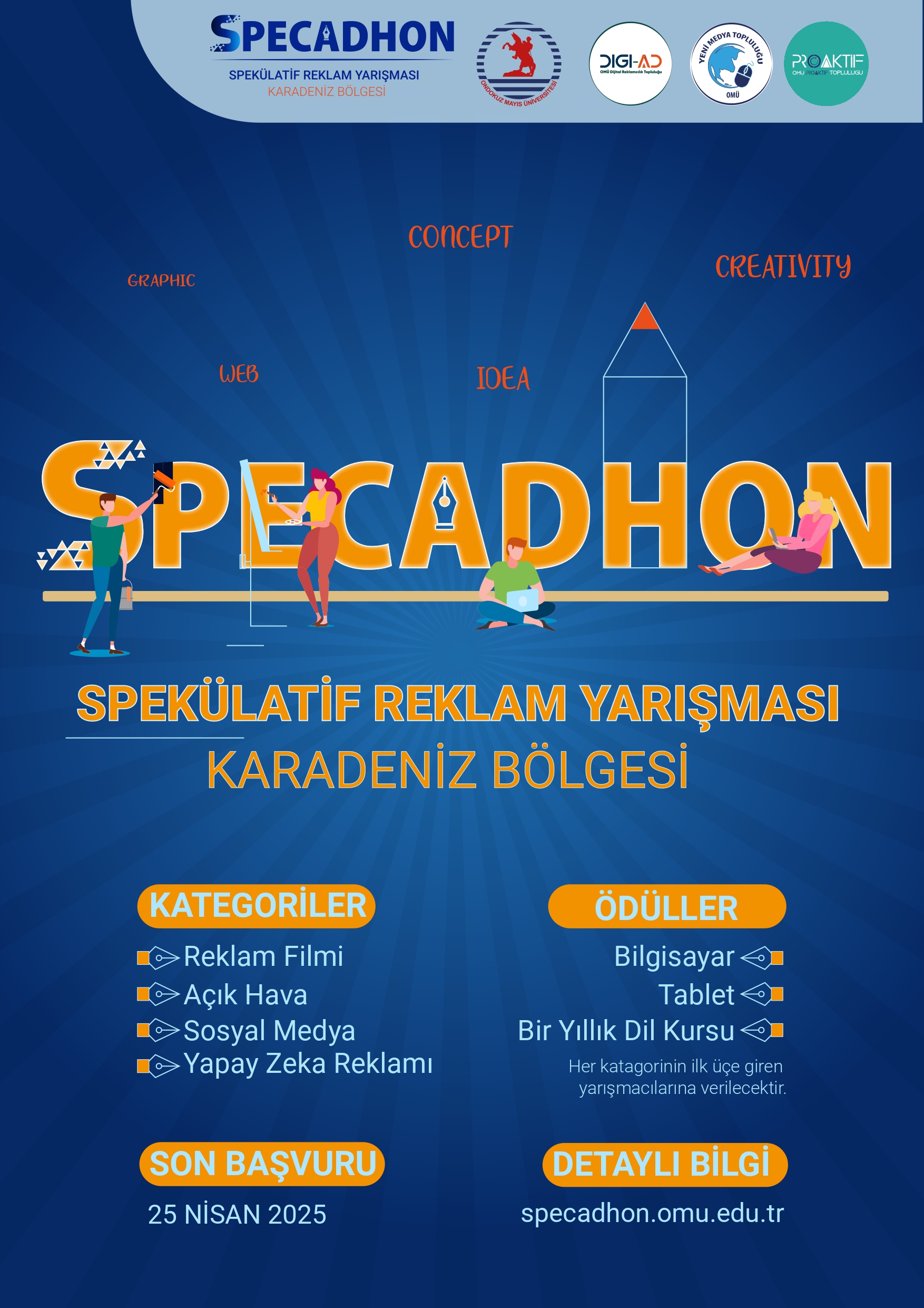 OMÜ Dijital Reklamcılık Topluluğu öğrencilerimizin, OMÜ Yeni Medya Topluluğu ve OMÜ ProAktif Topluluğu iş birliğiyle düzenlenecek Spekülatif Reklam Yarışması (SPECADHON), yaşanan organizasyonel gereklilikler nedeniyle 25 Nisan 2025 tarihine ertelenmiştir.