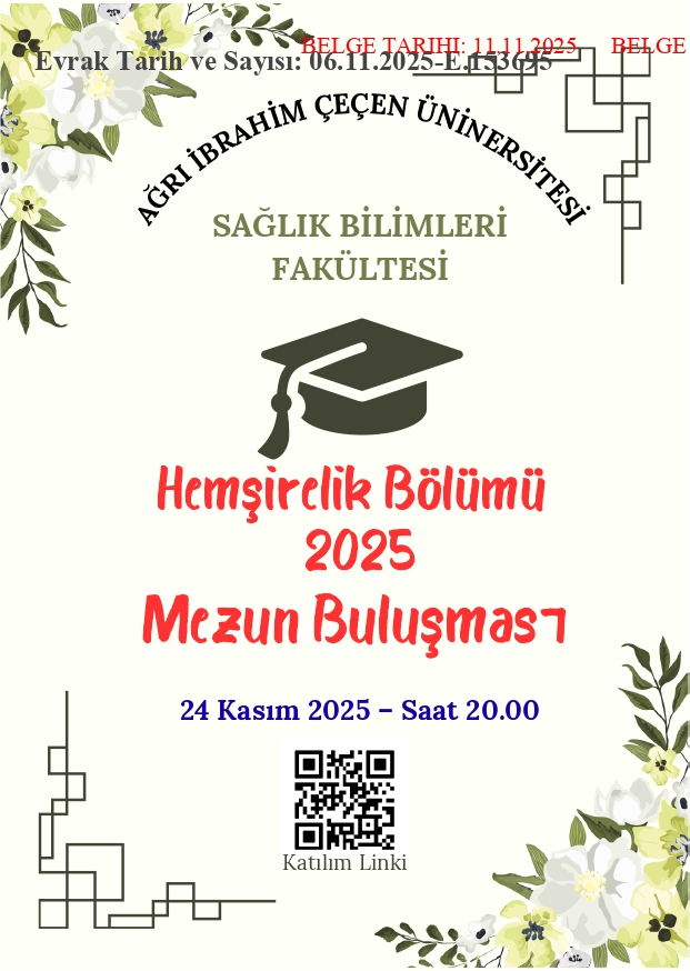 Ağrı İbrahim Çeçen Üniversitesi Üniversitemiz Sağlık Bilimleri Fakültesi Hemşirelik Bölümü tarafından 24 Kasım 2025 tarihinde saat 20:00'da "Hemşirelik Bölümü 2025 Mezun Buluşması" gerçekleştirilecektir.