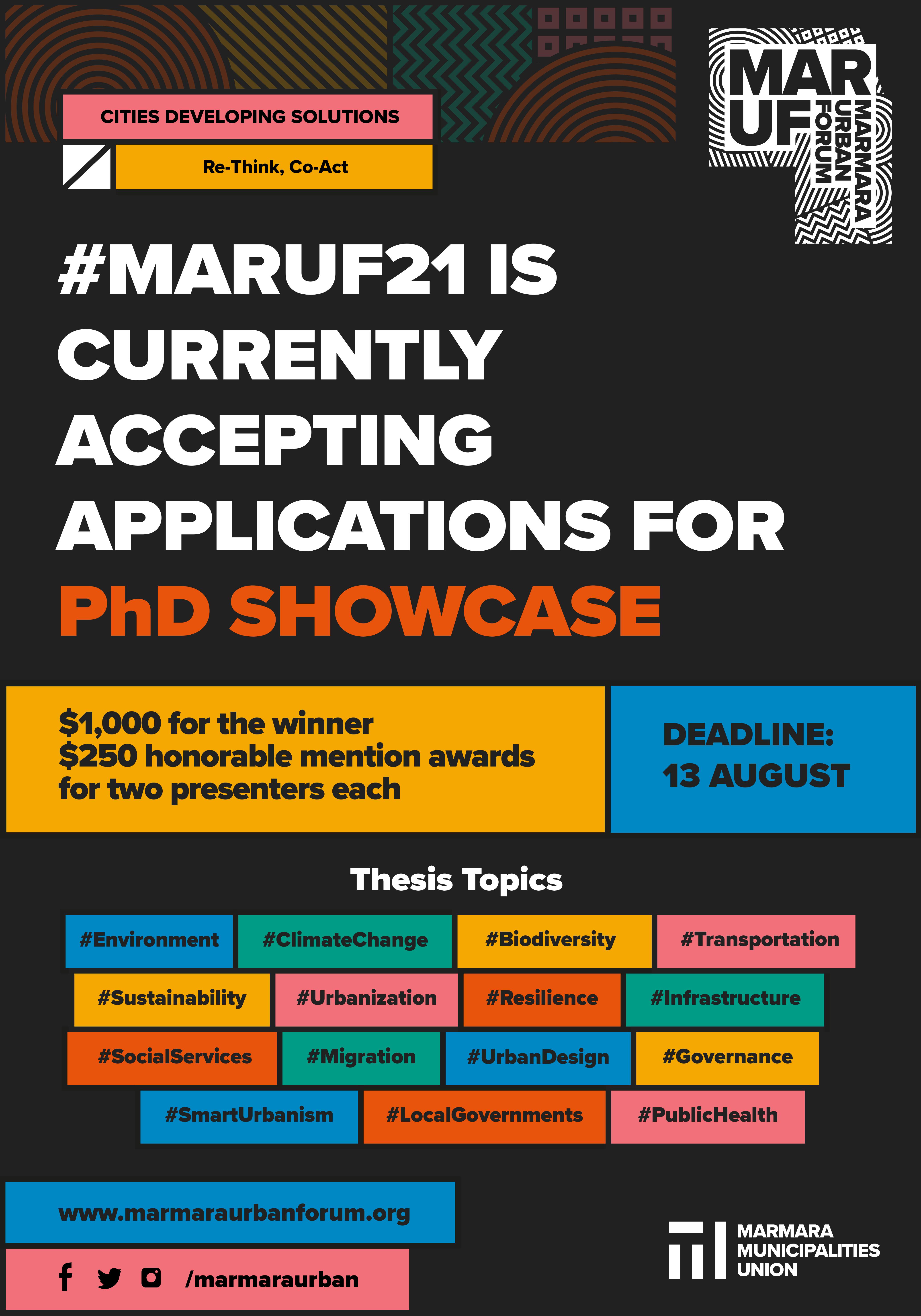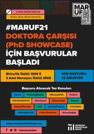 Şehirleşme, çevre ve yerel yönetimler gibi alanlarda küresel ölçekte bilgi ve deneyim paylaşımını sağlamada etkili bir platform olan Marmara Urban Forum / Marmara Uluslararası Kent Forumu (MARUF) kapsamında PhD Showcase - Doktora Çarşısı adlı özel oturum ikinci kez düzenlenecektir. Bu özel oturumda, doktora programlarına kayıtlı olan araştırmacıların tez araştırmalarını, maksimum 3 dakika içerisinde, sözlü şekilde ve İngilizce olarak sunmaları beklenmektedir. Çalışmalarını sunan araştırmacılar belediye başkanları, akademisyen ve uygulamacılardan oluşan bir jüri tarafından değerlendirilerek ödüllendirilecektir.