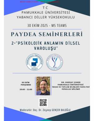 Pamukkale Üniversitesi Yabancı Diller Yüksekokulu Akademik ve Sosyal Aktive Koordinatörlüğü'nün 2025-2026 Eğitim Öğretim Yılında Microsoft Teams platformu üzerinden çevrimiçi olarak düzenleyeceği Pamukkale Üniversitesi Yabancı Diller Yüksekokulu Dil ve Edebiyat Araştırmaları (PAYDEA) seminerlerinin ikincisi "Psikolojik Anlamın Dilsel Varoluşu" adlı seminer 30.10.2025 tarihinde saat 20.00'de gerçekleştirilecektir.