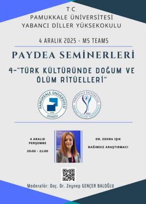 Pamukkale Üniversitesi Yabancı Diller Yüksekokulu Akademik ve Sosyal Aktivite Koordinatörlüğü'nün 2025-2026 Eğitim Öğretim Yılında Microsoft Teams platformu üzerinden çevrimiçi olarak düzenleyeceği Pamukkale Üniversitesi Yabancı Diller Yüksekokulu Dil ve Edebiyat Araştırmaları (PAYDEA) seminerlerinin dördüncüsü "Türk Kültüründe Doğum ve Ölüm Ritüelleri" adlı seminer 4 Aralık 2025 tarihinde saat 20.00'de gerçekleştirilecektir.