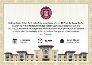 2025-2026 Akademik Yılı açılışı kapsamında, 23 Ekim 2025 Perşembe günü saat 11.00'de, Ankara Sosyal Bilimler Üniversitesi Sümerbank Konferans Salonu'nda Atatürk Kültür, Dil ve Tarih Yüksek Kurumu Başkanı Sayın BE Prof. Dr. Derya ÖRS'ün teşrifleriyle "Türk Kültürünün Köşe Taşları" üzerine yapacağı konuşmayla 2025-2026 Akademik Yılı Konferansı düzenlenecektir.