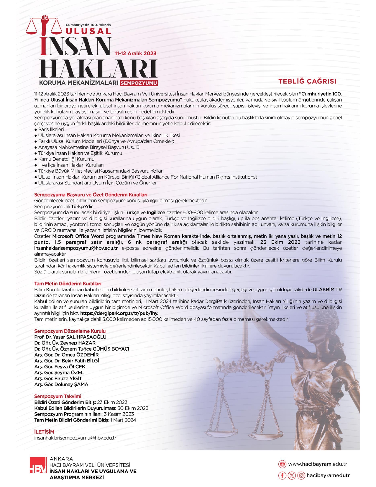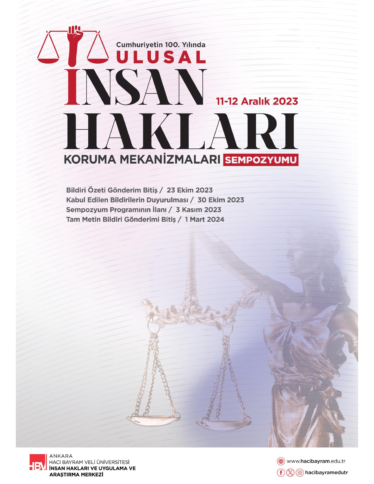 Ankara Hacı Bayram Veli Üniversitesi İnsan Hakları Uygulama ve Araştırma Merkezinin 11-12 Aralık 2023 tarihinde "Cumhuriyetin 100. Yılında Ulusal İnsan Hakları Koruma Mekanizmaları Sempozyumu" düzenlenecektir.
