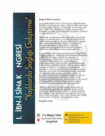 Zonguldak Bülent Ecevit Üniversitesi Sağlık Bilimleri Fakültesi Bilimsel Etkinlik Düzenleme Komisyonu tarafından 02- 04 Mayıs 2024 tarihinde "I.İbn-i Sina Uluslararası Sağlık Araştırmaları Kongresi (I. Avicenna International Health Research Congress)" kongresi düzenlenecektir. Kongre ile ilgili detaylı bilgi için ek'te bulunan posteri inceleyebilirsiniz.