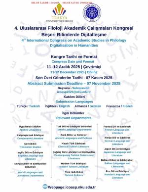 Trakya Üniversiteler Birliği etkinlikleri kapsamında, Tekirdağ Namık Kemal Üniversitesi ev sahipliğinde 11- 12 Aralık 2025 tarihlerinde çevrim içi olarak "Beşeri Bilimlerde Dijitalleşme" temalı "IV. Uluslararası Filoloji Akademik Çalışmaları Kongresi" düzenlenecektir.