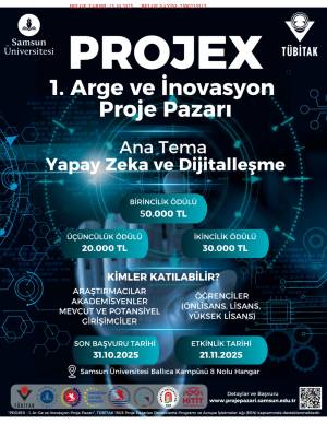 Samsun Üniversitesi ev sahipliğinde, TÜBİTAK, Samsun Ticaret ve Sanayi Odası, Ondokuz Mayıs Üniversitesi, Hitit Üniversitesi, Amasya Üniversitesi, Tokat Gaziosmanpaşa Üniversitesi paydaşlığında 21.11.2025 tarihinde "PROJEX - 1. Ar-Ge ve İnovasyon Proje Pazarı" etkinliği düzenlenecektir. Etkinliğin ana teması "Yapay Zeka ve Dijitalleşme" olup etkinlik kapsamında yapay zeka ve dijital teknolojilere odaklı yenilikçi projelerin teşvik edilmesi, akademi-sanayi ve girişimciler arasında köprü kurulması, ticarileşme süreçlerinin hızlandırılması, dijital dönüşüm farkındalığının artırılması, Ar-Ge ve inovasyon kültürünün yaygınlaştırılması, ulusal teknolojik gelişime katkı sunulması hedeflenmektedir.
