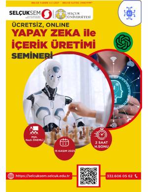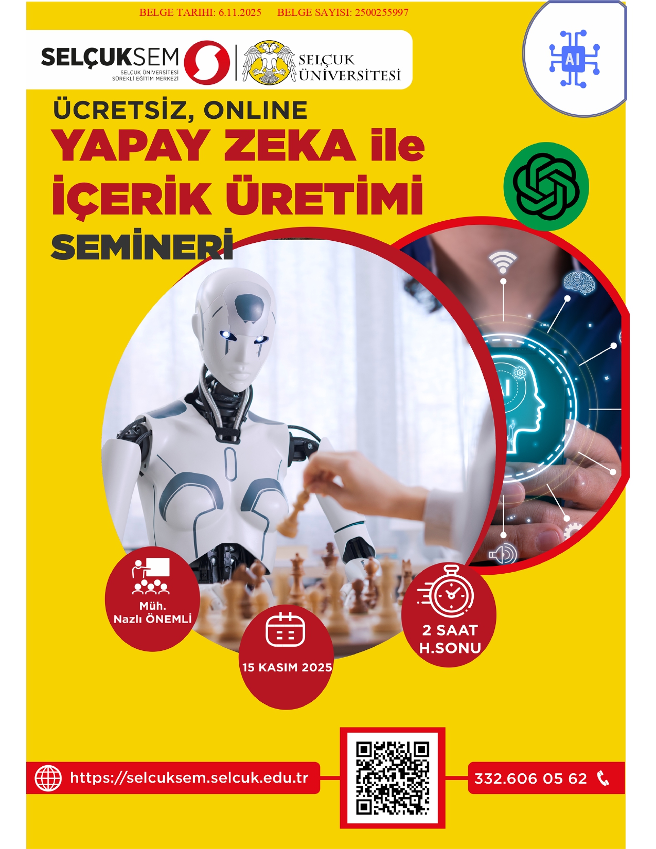 Selçuk Üniversitesi Sürekli Eğitim Uygulama ve Araştırma Merkezi Müdürlüğü tarafından, günümüzün hızla gelişen dijital dönüşüm sürecine katkı sağlamak amacıyla "Yapay Zekâ ile İçerik Üretimi" başlıklı ücretsiz ve çevrim içi bir seminer programı düzenlenmesi planlanmaktadır.