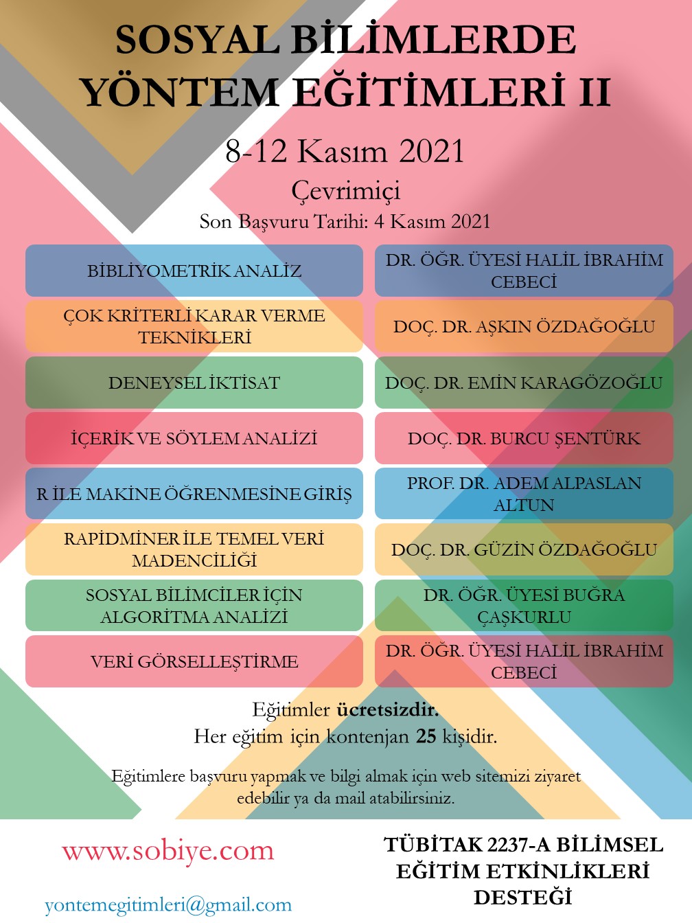 Selçuk Üniversitesi İktisadi ve İdari Bilimler Fakültesinin TÜBİTAK 2237-A desteğiyle ücretsiz olarak düzenlediği "Sosyal Bilimlerde Yöntem Eğitimleri" konulu etkinlik, 08-12 Kasım 2021 tarihleri arasında çevrim içi (on-line) formatta katılımcılara hitap edecek.