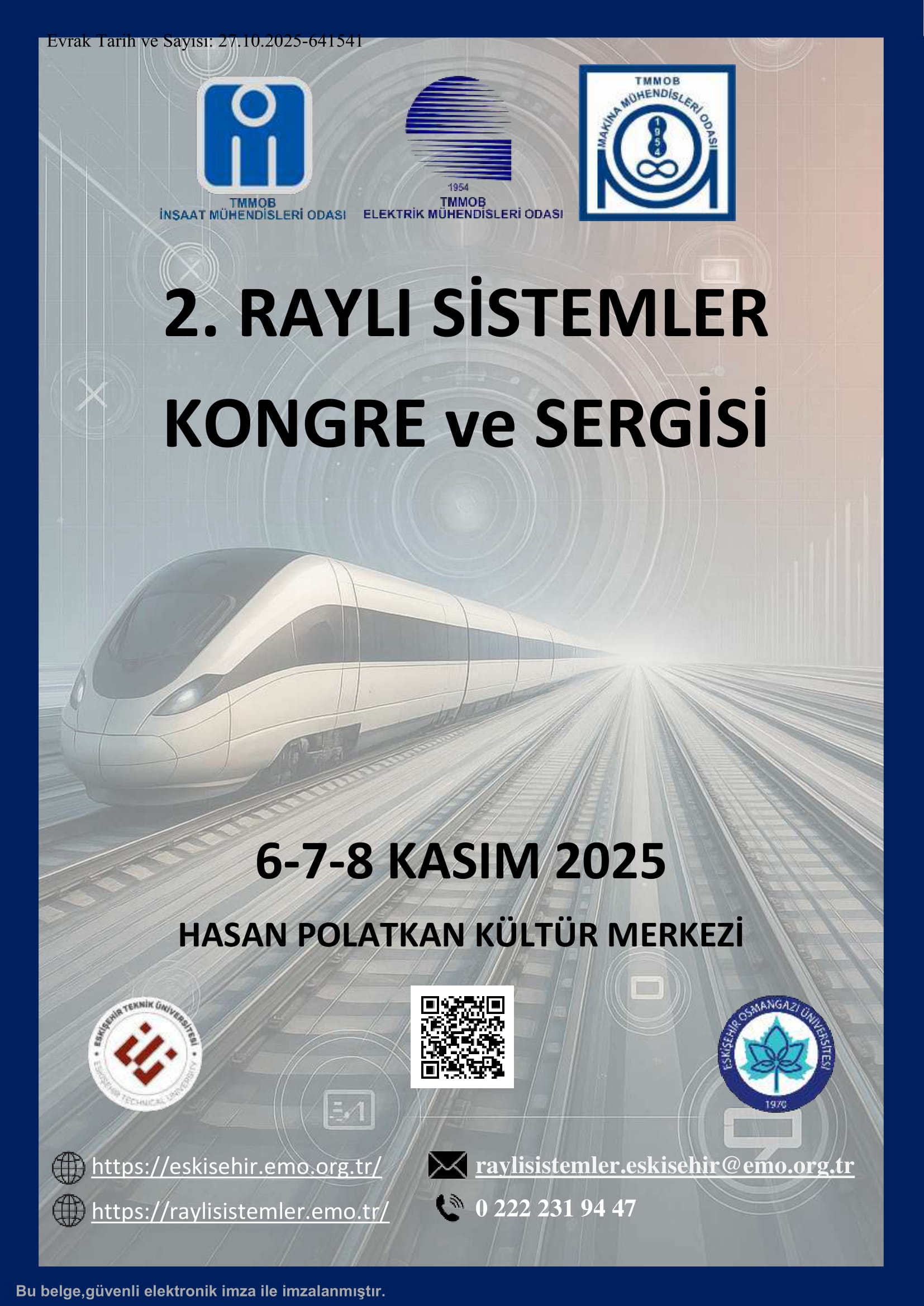 Eskişehir Teknik Üniversitesi ve Eskişehir Osmangazi Üniversitesi paydaşlığında; Elektrik Mühendisleri Odası Eskişehir Şubesi, Makine Mühendisleri Odası Eskişehir Şubesi ve İnşaat Mühendisleri Odası Eskişehir Şubesi tarafından 6-7-8 Kasım 2025 tarihlerinde Eskişehir Odunpazarı Belediyesi Hasan Polatkan Kültür Merkezi’nde “2. Raylı Sistemler Kongre ve Sergisi” gerçekleştirilecektir.