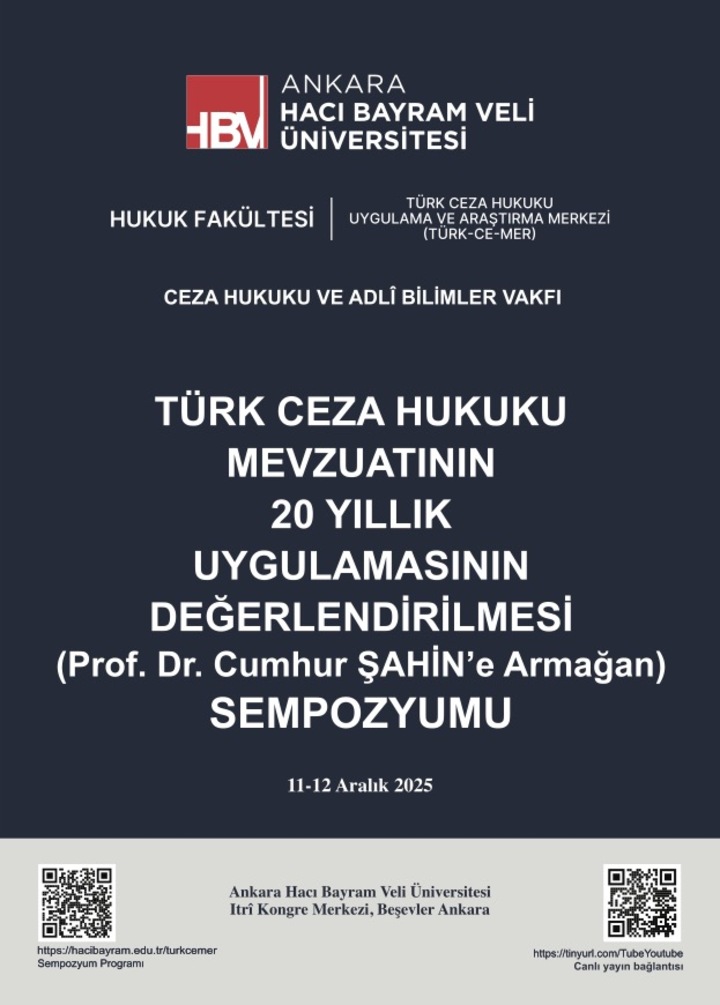 Ankara Hacı Bayram Veli Üniversitesi Hukuk Fakültesi ile Türk Ceza Hukuku Uygulama ve Araştırma Merkezi tarafından 11-12 Aralık 2025 tarihlerinde Üniversitemiz Itrî Kongre ve Kültür Merkezinde "Türk Ceza Hukuku Mevzuatının 20 Yıllık Uygulamasının Değerlendirilmesi (Prof. Dr. Cumhur ŞAHİN'e Armağan) Sempozyumu" gerçekleştirilecektir.