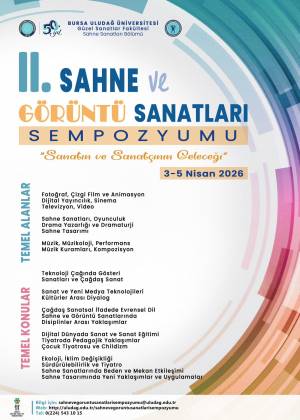 Bursa Uludağ Üniversitesi Güzel Sanatlar Fakültesi Sahne Sanatları Bölümü tarafından 3-5 Nisan 2026 tarihleri arasında Bursa Uludağ Üniversitesi Görükle Kampüsü'nde "II. Sahne ve Görüntü Sanatları Sempozyumu" düzenlenecektir.