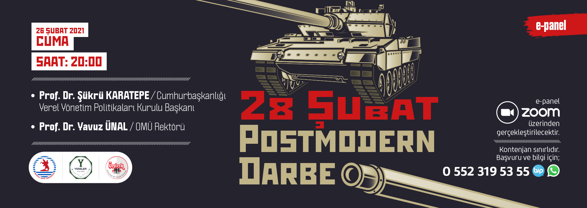 26 Şubat Cuma günü saat 20:00’de Cumhurbaşkanlığı Yerel Yönetim Politikaları Kurulu Başkanı Prof. Dr. Şükrü Karatepe ve Ondokuz Mayıs Üniversitesi Rektörü Prof. Dr. Yavuz Ünal’ın panelist olarak katılacağı Postmodern Darbenin anlatılacağı e-panel düzenlenecektir.