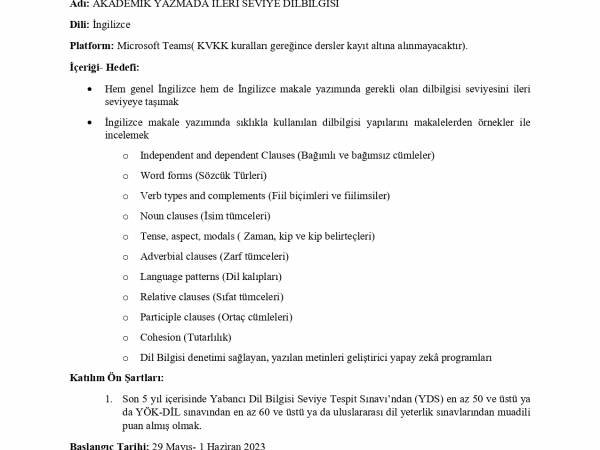 Gazi Üniversitesi Akademik Yazma Uygulama ve Araştırma Merkezi tarafından 29 Mayıs 2023-1 Haziran 2023 tarihleri arasında çevrim içi "Akademik Yazmada İleri Seviye Dilbilgisi" kursu düzenlenecektir.