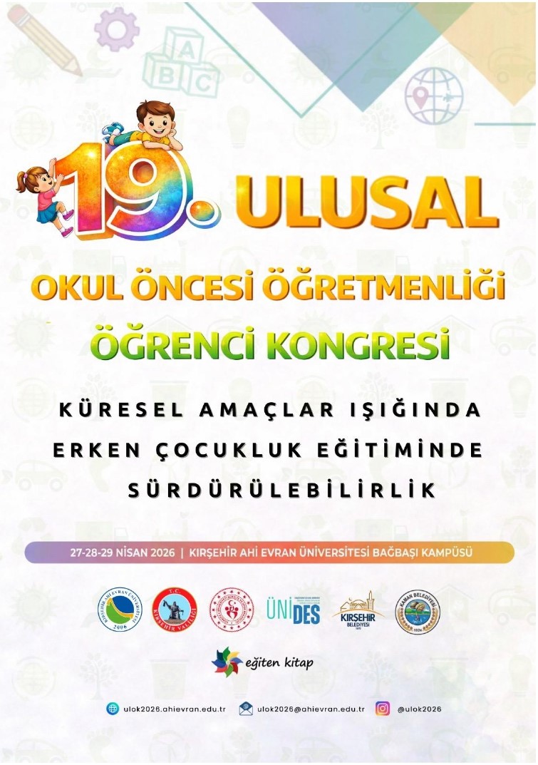 Kırşehir Ahi Evran Üniversitesi ev sahipliğinde 27-29 Nisan 2026 tarihleri arasında “19. Ulusal Okul Öncesi Öğretmenliği Öğrenci Kongresi” düzenlenecektir.