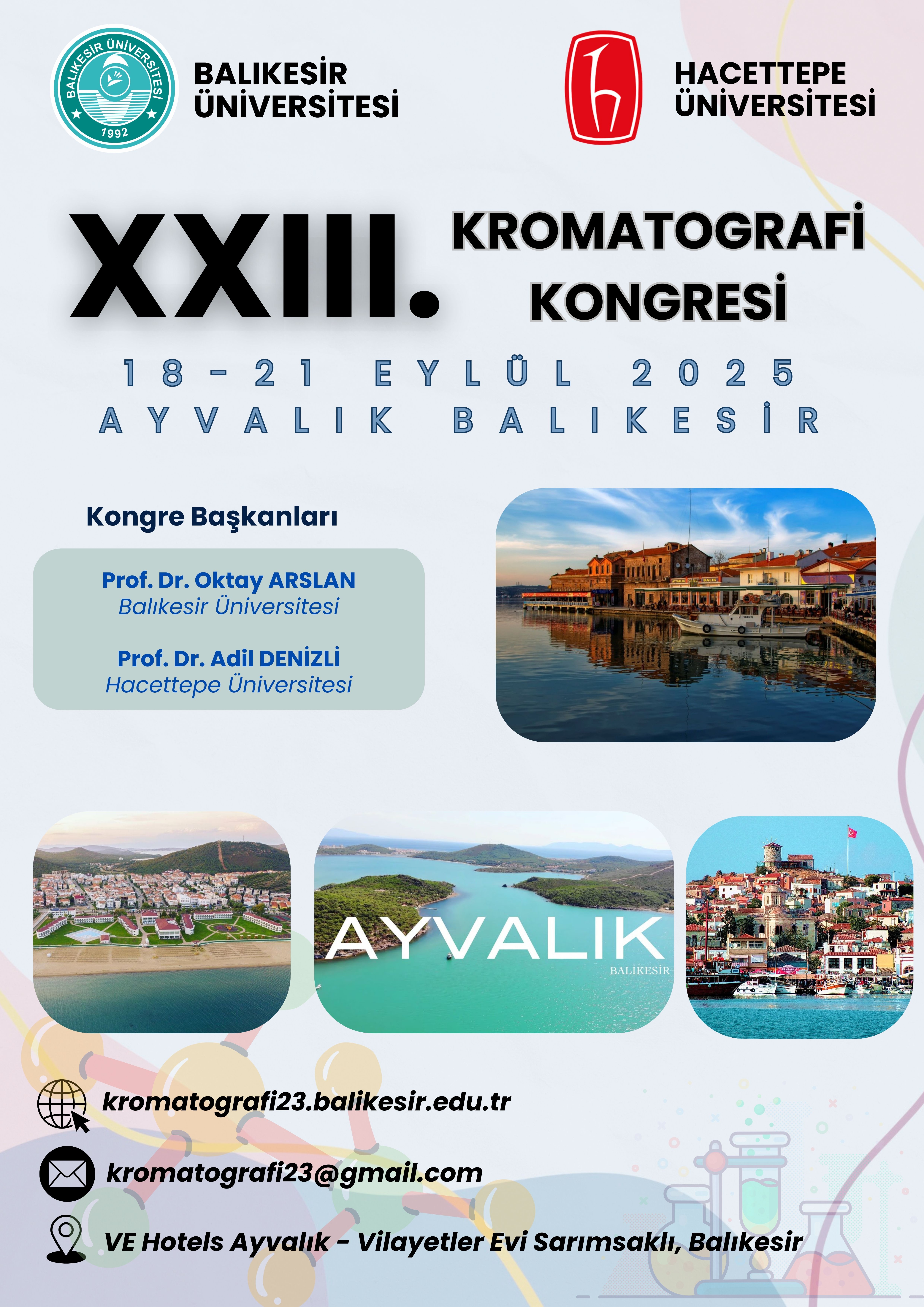 Balıkesir Üniversitesi ev sahipliğinde ve Hacettepe Üniversitesi iş birliğiyle düzenlenecek olan 23. Ulusal Kromatografi Kongresi'ne (Kromatografi-23) katılmaya davet etmekten mutluluk duyuyoruz. Kongre, 18-21 Eylül 2025 tarihleri arasında Ayvalık, Balıkesirde gerçekleştirilecektir. Üç gün sürecek olan kongre, yetkin davetli konuşmacıların ve katılımcıların güncel çalışmalarını Türkçe sözlü/poster sunumlarla tartışacağı bilimsel oturumlar şeklinde gerçekleştirilecektir.