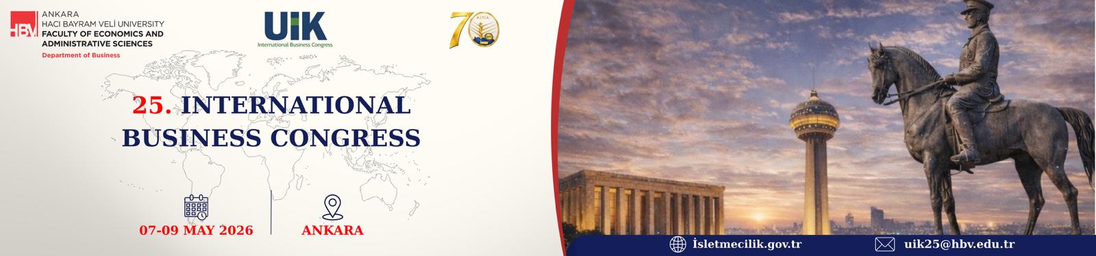 Ankara Hacı Bayram Veli Üniversitesi İktisadi ve İdari Bilimler Fakültesi İşletme Bölümü tarafından, 07–09 Mayıs 2026 tarihleri arasında 25. Uluslararası İşletmecilik Kongresi düzenlenecektir.