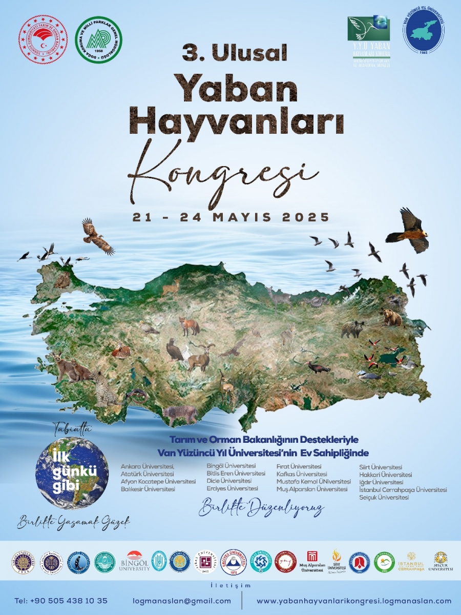 Van Yüzüncü Yıl Üniversitesinin ev sahipliğinde, Tarım ve Orman Bakanlığının destekleriyle çok sayıda Üniversite ve sivil toplum kuruluşlarıyla birlikte 21-24 Mayıs 2025 tarihinde 3. Ulusal Yaban Hayvanları Kongresi düzenlenecektir.