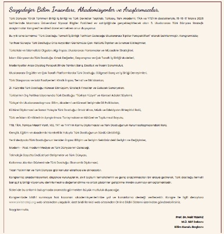 Marmara Üniversitesi Siyasal Bilgiler Fakültesi ve Türk Dünyası Yörük Türkmen Birliği iş birliği ile Türk Devletler Teşkilatı, Türksoy, Türk Akademi, TİKA ve YTB'nin destekleriyle 15-16-17 Mayıs 2026 tarihlerinde Marmara Üniversitesi Siyasal Bilgiler Fakültesi ev sahipliğinde "Türk Dostluğu Temelli İş Birliği: Tarihten Geleceğe Uluslararası İlişkiler Perspektifleri" temalı 3. Uluslararası Türk Dünyası Stratejik Araştırmalar Kongresi gerçekleştirecektir.