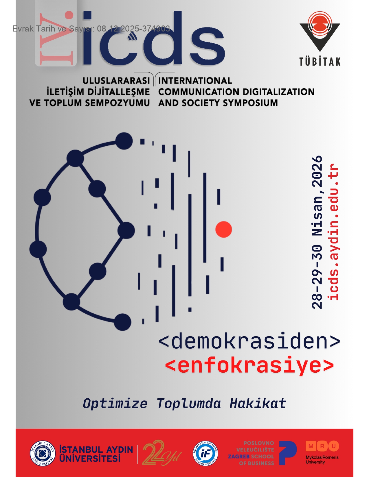 İstanbul Aydın Üniversitesi İletişim Fakültesi'nin ev sahipliğinde Zagreb School of Business ve Mykolas Romeris Universty ile birlikte düzenlenen Uluslararası İletişim, Dijitalleşme ve Toplum Sempozyumu'nun dördüncüsü ‘"Demokrasiden Enfokrasiye: Optimize Toplumda Hakikat" temasıyla gerçekleştiriliyor. Akademisyenleri, sivil toplum ve sektör temsilcilerini, doktora ve yüksek lisans öğrencilerini buluşturan bir platform olmayı hedefleyen sempozyum, 28-29-30 Nisan 2026 tarihleri arasında hibrit olarak düzenlenecektir.
