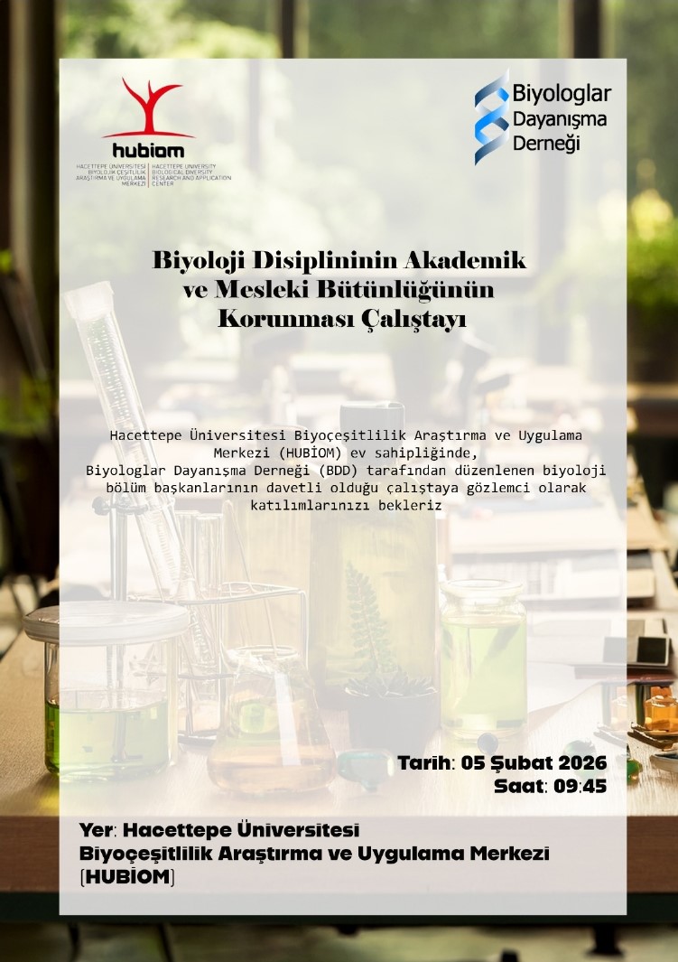 Hacettepe Üniversitesi Biyolojik Çeşitlilik Araştırma ve Uygulama Merkezi (HUBİOM) ev sahipliğinde, Biyologlar Dayanışma Derneği (BDD) tarafından, 5 Şubat 2026 tarihinde HUBİOM Konferans Salonu’nda, bir gün süreli olarak ‘’Biyoloji Disiplininin Akademik ve Mesleki Bütünlüğünün Korunması Çalıştayı’’ konulu bir çalıştay düzenlenecektir.