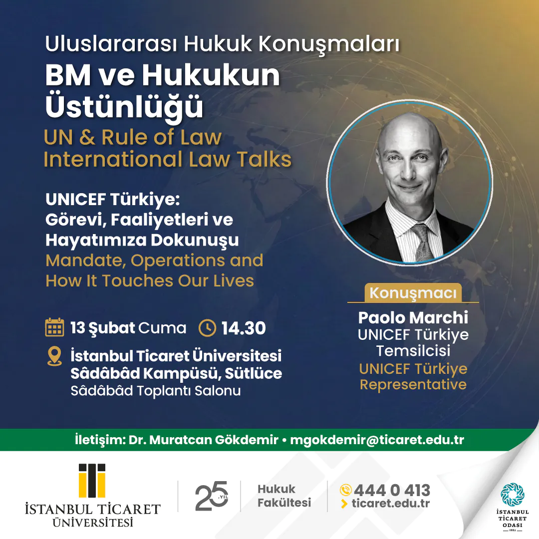İstanbul Ticaret Üniversitesi Hukuk Fakültesi tarafından düzenlenen "BM ve Hukukun Üstünlüğü - Uluslararası Hukuk Konuşmaları" konferans dizisi kapsamında, 13 Şubat 2026 Cuma günü, saat 14.30'da gerçekleştirilecek olan, "UNICEF Türkiye: Görevi, Faaliyetleri ve Hayatımıza Dokunuşu" başlıklı konuşması için UNICEF Türkiye Temsilcisi İtalyan Hukukçu Paolo MARCHI İstanbul Ticaret Üniversitesi'nde ağırlanacaktır.