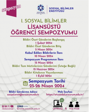 Erzurum Teknik Üniversitesi Sosyal Bilimler Enstitüsü tarafından 14-15 Mayıs 2026 tarihlerinde çevrim içi ve yüz yüze olarak III. Sosyal Bilimler Lisansüstü Öğrenci Sempozyumu" düzenlenmesi planlanmaktadır. Sempozyumun amacı, sosyal bilimler alanında kavramsal, yöntemsel ve ampirik sorunlar hakkında bilgi paylaşımını artırmak ve Türkiye’de sosyal bilimler alanındaki araştırma konularını farklı kuramsal ve yöntemsel bakış açıları ile inceleyen araştırmalara katkıda bulunmaktır. Ayrıca farklı disiplinlerden gelen lisans üstü öğrencilerin ürettiği bilgi, düşünce ve yaklaşımların akademik bir ortamda paylaşılmasına olanak sağlayarak gelişimlerinin desteklenmesi de amaç edinilmiştir.