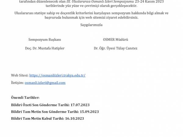 Trakya Üniversitesi Osmanlı Medeniyeti Çalışmaları Uygulama ve Araştırma Merkezi (OSMER) tarafından düzenlenecek olan "III. Uluslararası Osmanlı İzleri Sempozyumu" 23-24 Kasım 2023 tarihlerinde yüz yüze ve çevrimiçi olarak gerçekleşecektir.