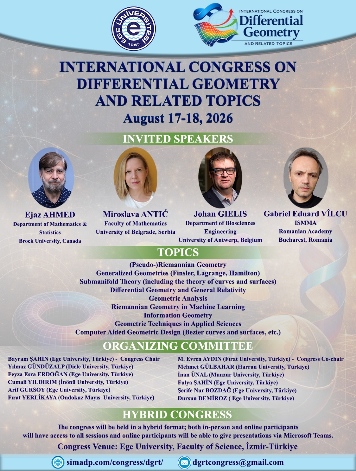 Ege Üniversitesi’nde, 17-18 Ağustos 2026 tarihleri arasında INTERNATIONAL CONGRESS ON DIFFERENTIAL GEOMETRY AND RELATED TOPICS isimli konferans düzenlenecektir.