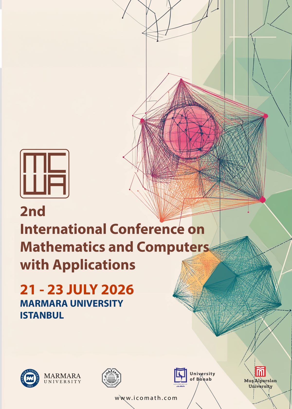 Marmara Üniversitesi Fen Fakültesi Matematik Bölümü tarafından 21- 23 Temmuz 2026 tarihinde "2nd International Conference on Mathematics and Computers with Applications (MCWA-2026)" isimli konferans düzenlenecektir.