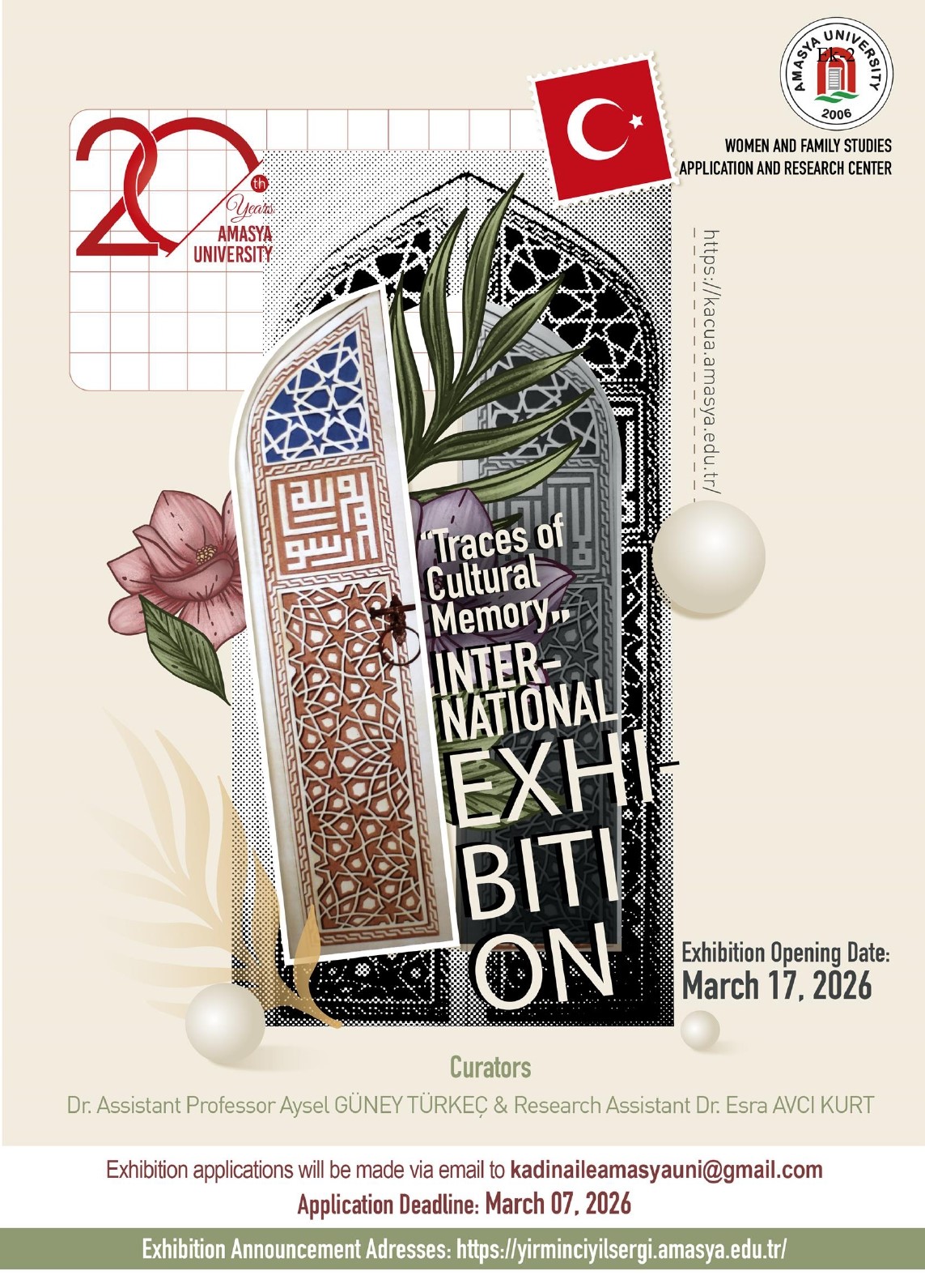 Amasya Üniversitesi'nin 20. kuruluş yılı kapsamında Amasya Üniversitesi Kadın ve Aile Çalışmaları Uygulama ve Araştırma Merkezi tarafından, 17 Mart-17 Nisan 2026 tarihleri arasında "Kültürel Belleğin İzleri" temalı "Uluslararası Online Karma Sergisi" çevrim içi (online) olarak gerçekleştirilecektir.