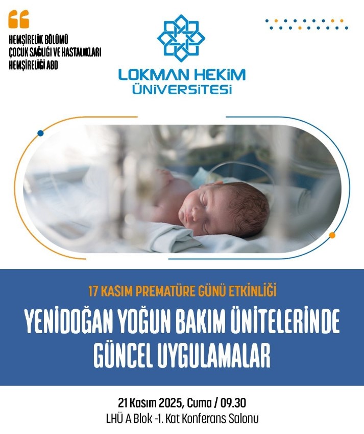 Lokman Hekim Üniversitesi Sağlık Bilimleri Fakültesi, Hemşirelik Bölümü Çocuk Sağlığı ve Hastalıkları Hemşireliği Ana bilim Dalı tarafından 21.11.2025 tarihinde ''17 Kasım Dünya Prematüre Günü'' etkinliği düzenlenecektir. Etkinlik, Üniversite A Blok -1. Kat Konferans Salonu’nda gerçekleştirilecektir. Etkinlik ile ilgili ayrıntılı bilgiye www.lokmanhekim.edu.tr sitesi üzerinden erişilebilmektedir.