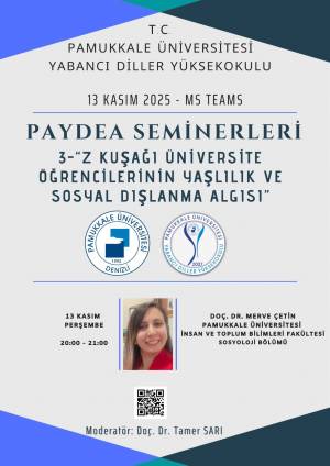Pamukkale Üniversitesi Yabancı Diller Yüksekokulu Akademik ve Sosyal Aktivite Koordinatörlüğü'nün 2025-2026 Eğitim Öğretim Yılında Microsoft Teams platformu üzerinden çevrimiçi olarak düzenleyeceği Pamukkale Üniversitesi Yabancı Diller Yüksekokulu Dil ve Edebiyat Araştırmaları (PAYDEA) seminerlerinin üçüncüsü "Z Kuşağı Üniversite Öğrencilerinin Yaşlılık ve Sosyal Dışlanma Algısı" adlı seminer 13 Kasım 2025 Perşembe günü saat 20.00'de gerçekleştirilecektir.