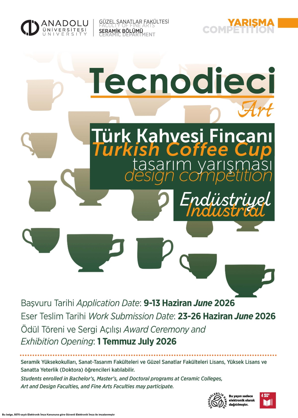 Anadolu Üniversitesi Güzel Sanatlar Fakültesi Seramik Bölümü tarafından 01-30 Temmuz 2026 tarihleri arasında ''Tecnodieci Art Türk Kahvesi Fincanı Tasarım'' yarışması düzenlenecektir.