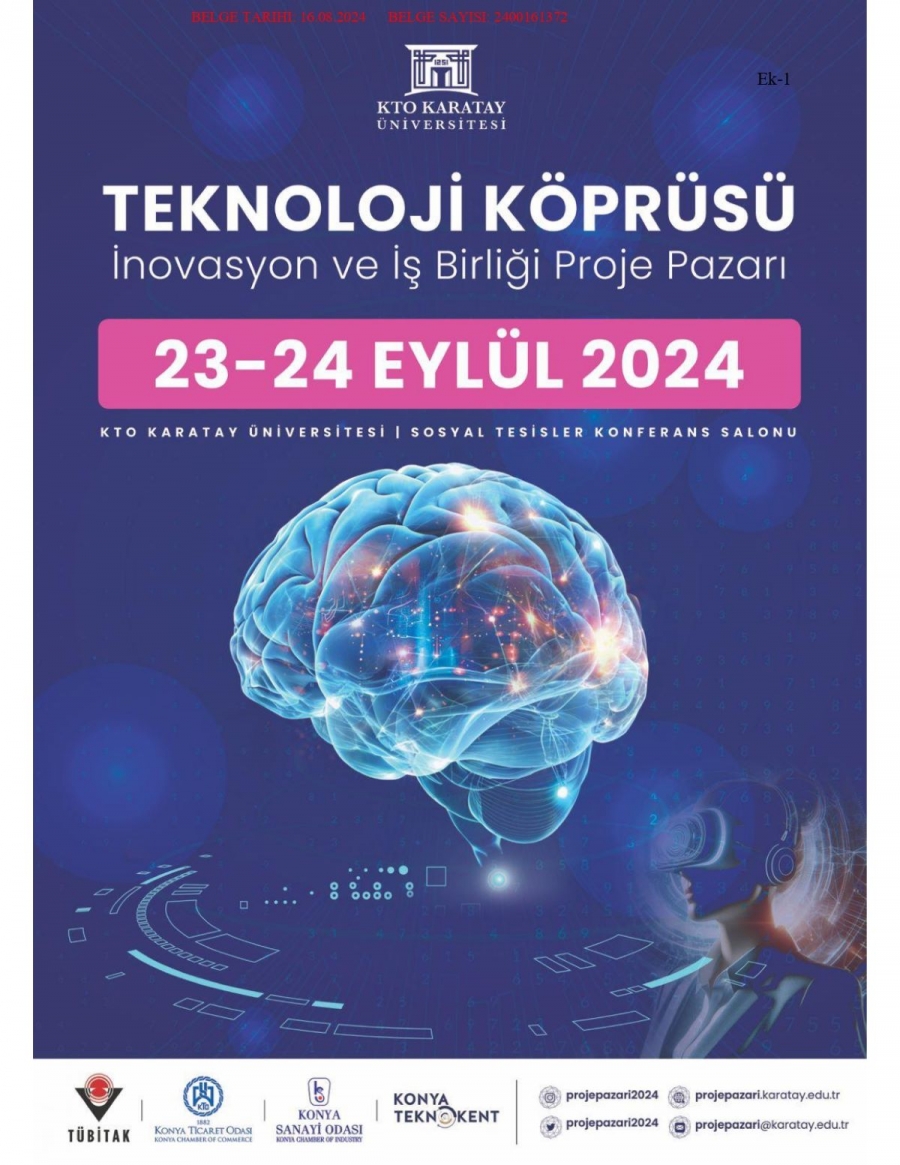 KTO- Karatay Üniversitesi bünyesinde 23 - 24 Eylül 2024 tarihleri arasında bölgedeki yenilikçi projelerin tanıtımı ile iş birliği fırsatlarının değerlendirilmesi açısından büyük önem taşıyan "Teknoloji Köprüsü: İnovasyon ve İş Birliği Proje Pazarı" etkinliği düzenlenecektir. Söz konusu etkinlik geleceğin teknolojilerine yön verecek projelerin hayata geçmesi için önemli bir platform sunmakta olup iş dünyası ve akademi arasındaki iş birliğini güçlendirme adına büyük bir katkı sağlayacaktır.