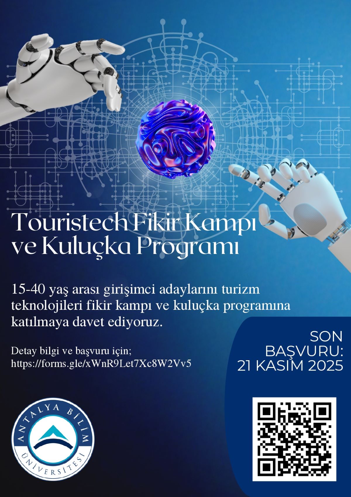 Antalya Bilim Üniversitesi TourisTech Turizm Teknolojileri Kuluçka Merkezi tarafından genç girişimcileri desteklemek amacıyla planlanan “İdea Fikir Kampı” ve “Kuluçka Programı” başvuruları 14–21 Kasım 2025 tarihleri arasında https://forms.gle/xWnR9Let7Xc8W2Vv5 internet adresi üzerinden alınacak olup, 22 Kasım – 5 Aralık 2025 tarihleri arasında yapılacak jüri değerlendirmesi sonrasında kabul edilen adaylar https://tto.antalya.edu.tr internet adresinden duyurulacaktır.