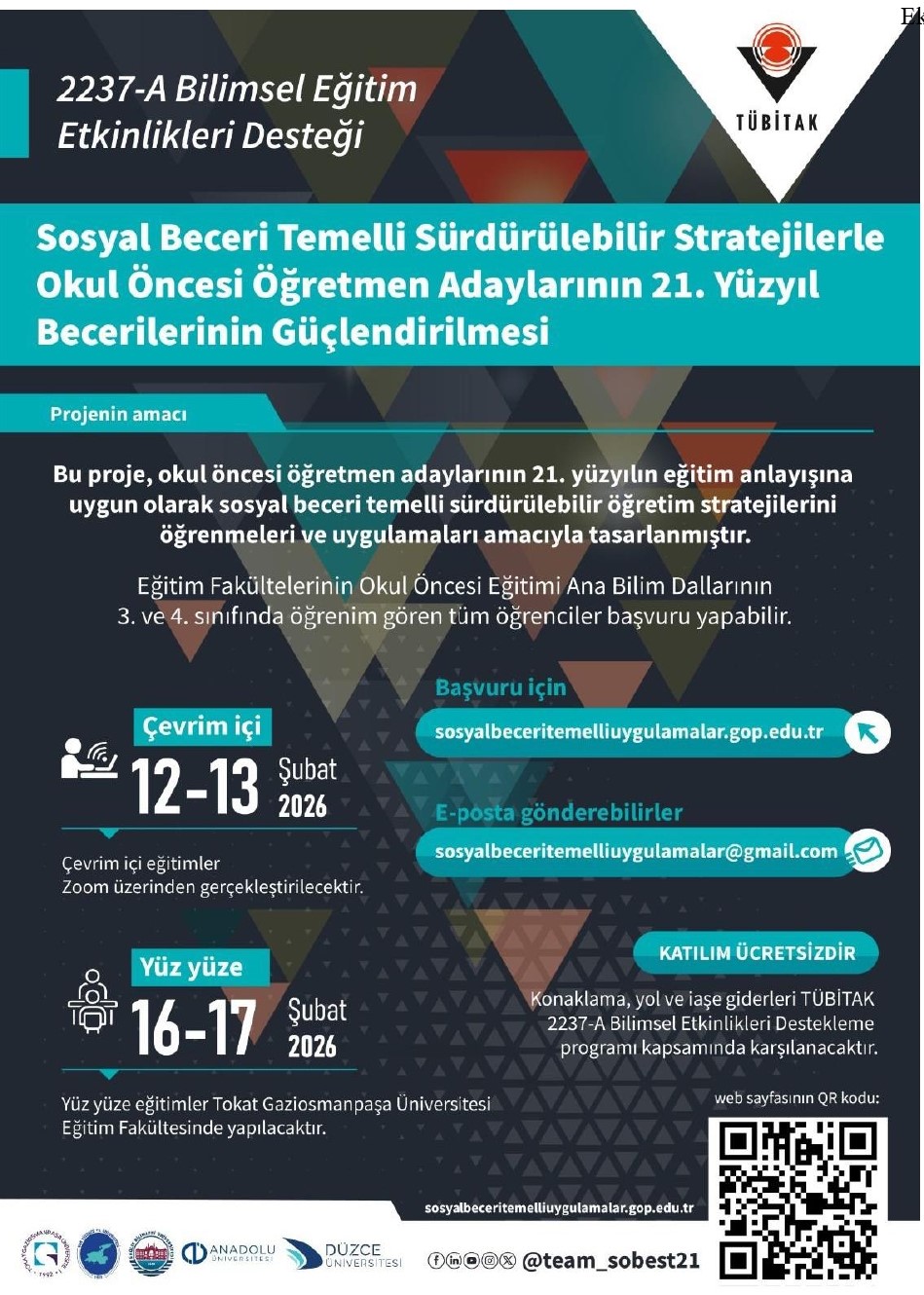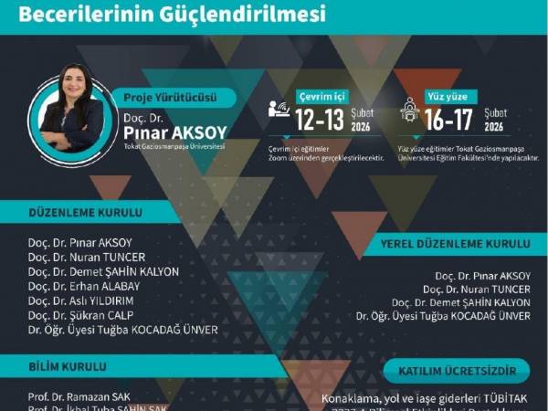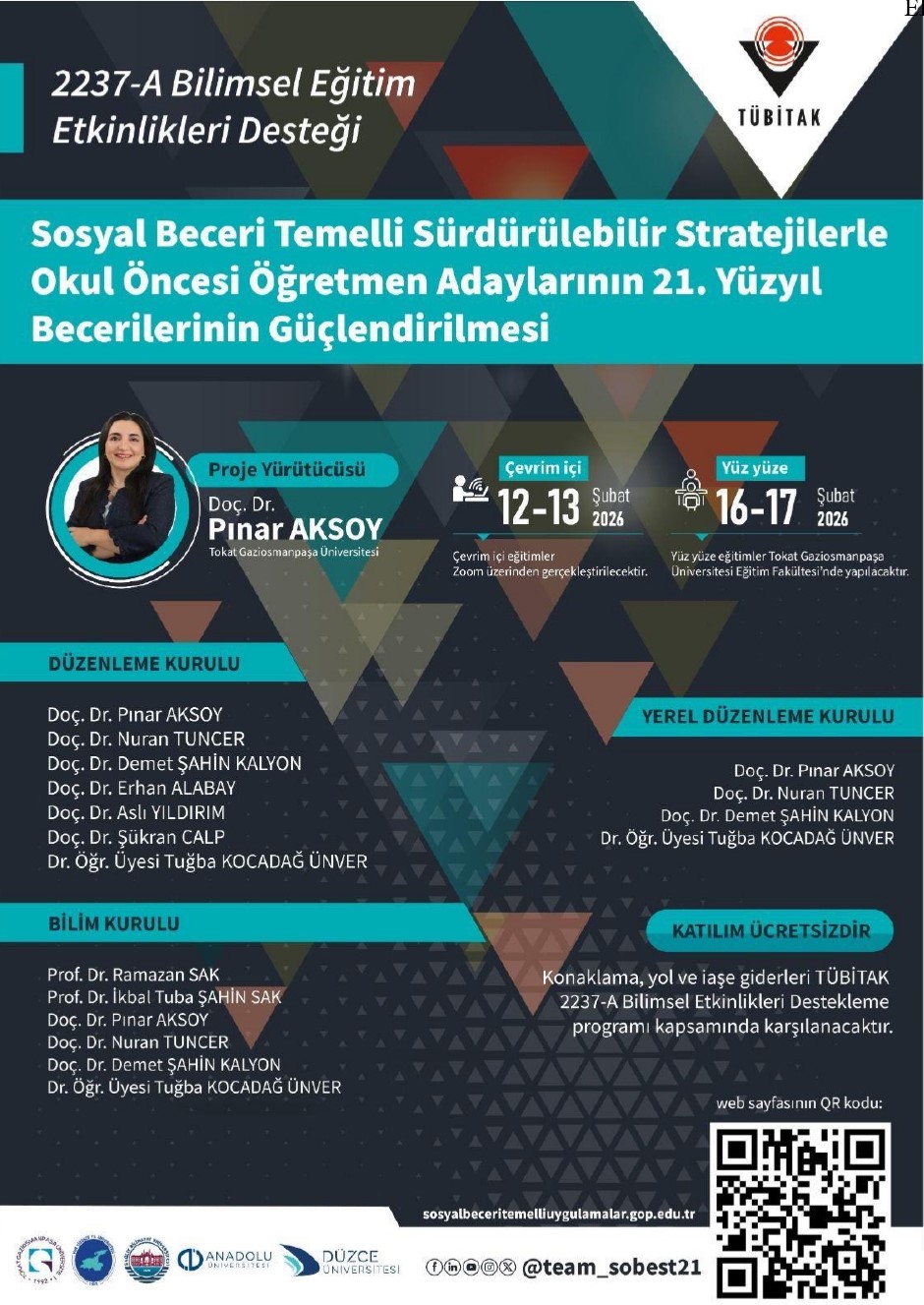 Tokat Gaziosmanpaşa Üniversitesi Eğitim Fakültesi Temel Eğitim Bölümü öğretim üyesi Doç. Dr. Pınar AKSOY'un yürütücülüğünü yaptığı ve TÜBİTAK Bilim İnsanı Destek Programları Başkanlığı (BİDEB) tarafından desteklenen 2237-A Bilimsel Eğitim Etkinlikleri Desteği Programı kapsamında "Sosyal Beceri Temelli Sürdürülebilir Stratejilerle Okul Öncesi Öğretmen Adaylarının 21. Yüzyıl Becerilerinin Güçlendirilmesi" başlıklı bilimsel eğitim etkinliği; 12–13 Şubat 2026 tarihlerinde çevrim içi (Zoom) ve 16–17 Şubat 2026 tarihlerinde ise Tokat Gaziosmanpaşa Üniversitesi Eğitim Fakültesi ev sahipliğinde yüz yüze olarak gerçekleştirilecektir. Bu doğrultuda gerçekleştirilecek eğitim etkinliklerine katılacak öğretmen adaylarının yol, konaklama ve iaşe giderleri TÜBİTAK 2237-A Bilimsel Eğitim Etkinlikleri Desteği Programı kapsamında karşılanacaktır.