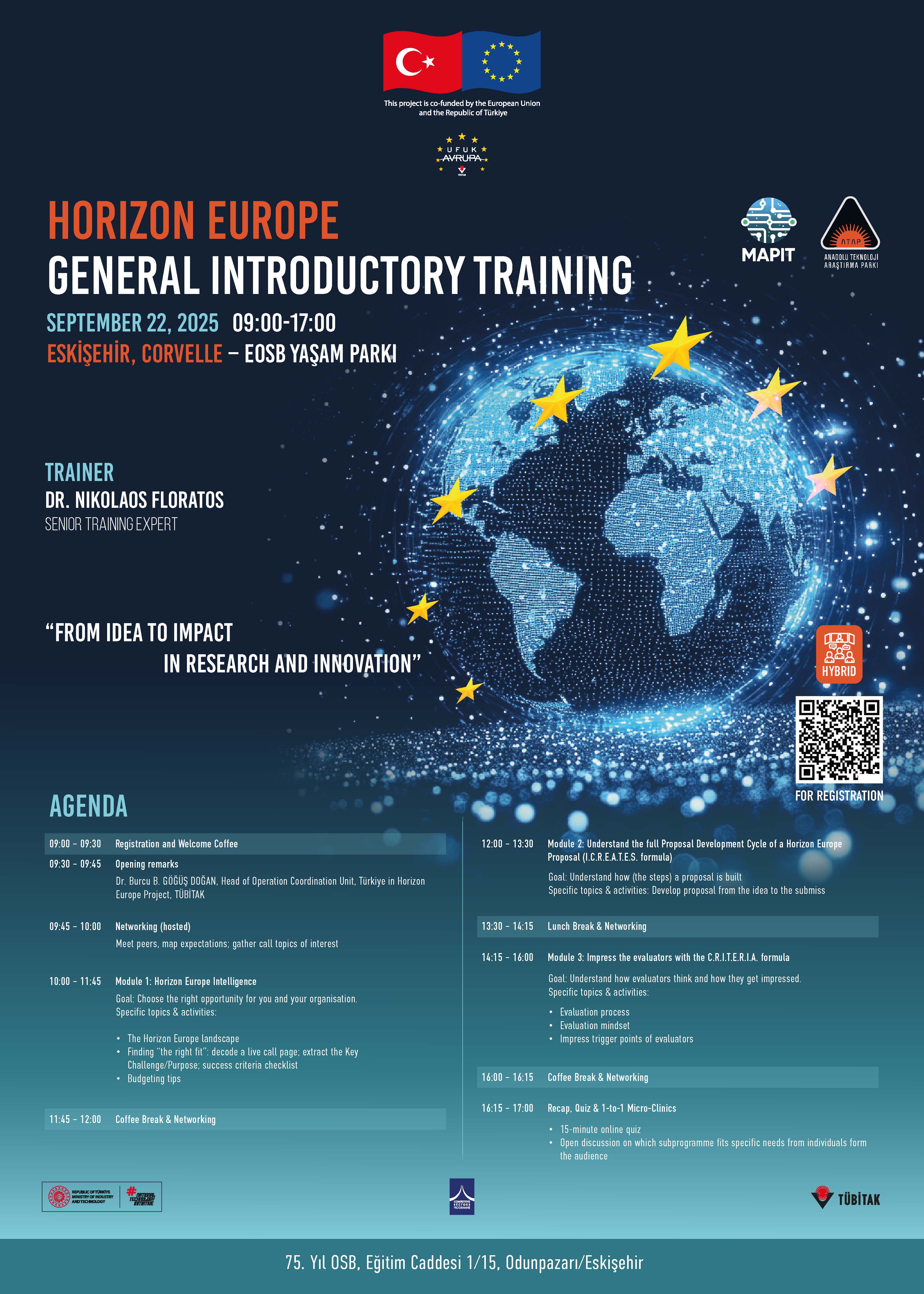 Avrupa Birliği ve Türkiye Cumhuriyeti tarafından ortak finanse edilen, T.C. Sanayi ve Teknoloji Bakanlığı tarafından yürütülen, nihai yararlanıcılığını TÜBİTAK'ın üstlendiği ve Rekabetçi Sektörler Programı kapsamında desteklenen "Ufuk Avrupa'da Türkiye" Teknik Destek Projesi çerçevesinde, 3 Ekim 2025 tarihinde çevrim içi olarak "Ufuk Avrupa Genel Bilgilendirme Eğitimi" düzenlenecektir.