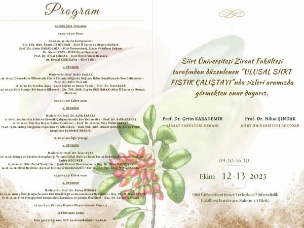 Siirt Üniversitesi Ziraat Fakültesi tarafından 12-13 Ekim 2023 tarihlerinde "Küresel İklim Değişikliği ve Sürdürülebilir Fıstık Üretimi" konulu Ulusal Siirt Fıstığı Çalıştayı düzenlenecektir. Çalıştayda akademisyenler, araştırmacılar, kurum ve sanayi temsilcileri bir araya gelerek iklim değişikliği ve sürdürülebilir fıstık üretimi ile ilgili sorunları gündeme alacak, bugüne kadar yapılan çalışmaları ve deneyimlerini paylaşacak, mevcut durumu değerlendireceklerdir.