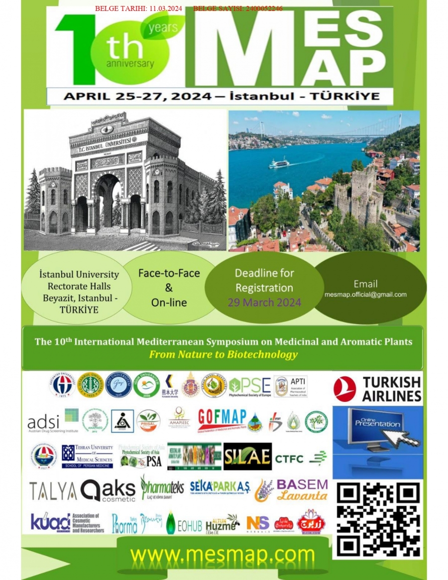 İstanbul Üniversitesi Biyoteknoloji ve Genetik Mühendisliği Uygulama ve Araştırma Merkezi Müdürlüğü katkılarıyla,İstanbul Üniversitesi ev sahipliğinde 25-27 Nisan 2024 tarihlerinde "10. Uluslararası Akdeniz Tıbbi ve Aromatik Bitkiler Sempozyumu'nun" (MESMAP-10) gerçekleştirilecektir.