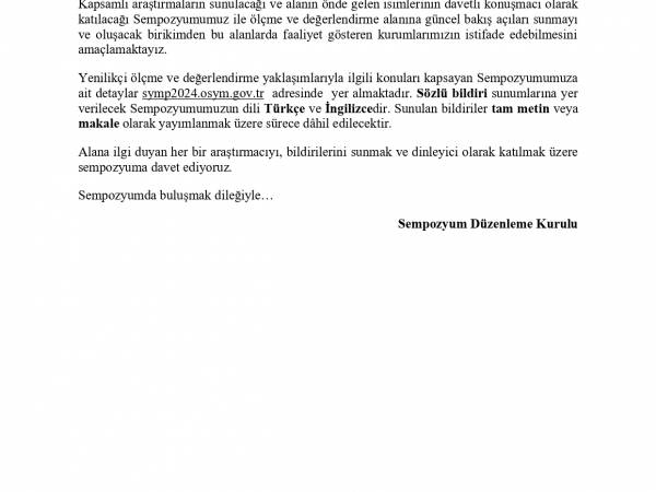 Millî Eğitim Bakanlığı (MEB) ve Ölçme, Seçme ve Yerleştirme Merkezi Başkanlığı (ÖSYM) iş birliği ile 4 - 6 Ekim 2024 tarihleri arasında Ankara'da ''Uluslararası Ölçme, Seçme ve Yerleştirme Sempozyumu'' düzenlenecektir