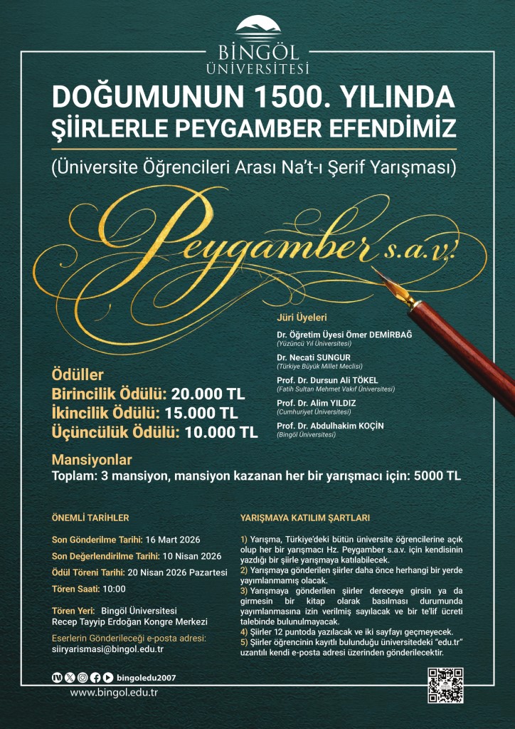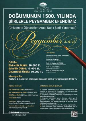 Âlemlere rahmet Hz. Muhammed s.a.v.'in doğumunun 1500. yılı münasebetiyle Bingöl Üniversitesi ev sahipliğinde, "Doğumunun 1500. Yılında Şiirlerle Peygamber Efendimiz" temalı Üniversite Öğrencileri Arası Na't-ı Şerif Ödüllü Yarışması" düzenlenecektir.