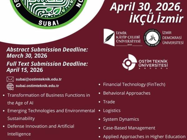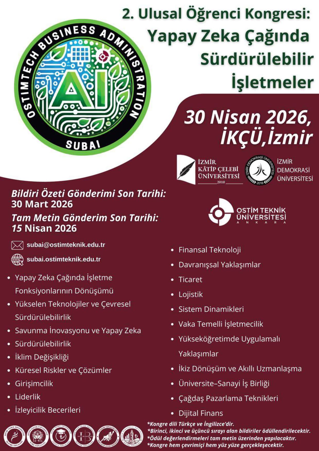 OSTİM Teknik Üniversitesi İktisadi ve İdari Bilimler Fakültesi İşletme Bölümü ile İzmir Demokrasi Üniversitesi iş birliğinde ve İzmir Kâtip Çelebi Üniversitesi ev sahipliğinde, işletme dünyasında yapay zekâ teknolojilerinin etkileri ile sürdürülebilirlik boyutunu ele almak amacıyla “Yapay Zekâ Çağında Sürdürülebilir İşletmeler 2. Ulusal Öğrenci Kongresi” düzenlenecektir.