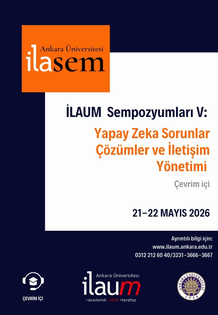 Ankara Üniversitesi İletişim Araştırmaları ve Uygulama Merkezi (İLAUM) tarafından 21-22 Mayıs 2026 tarihlerinde başlıklı çevrim içi ulusal "Yapay Zekâ: Sorunlar, Çözümler ve İletişim Yönetimi" sempozyumu gerçekleştirilecektir.