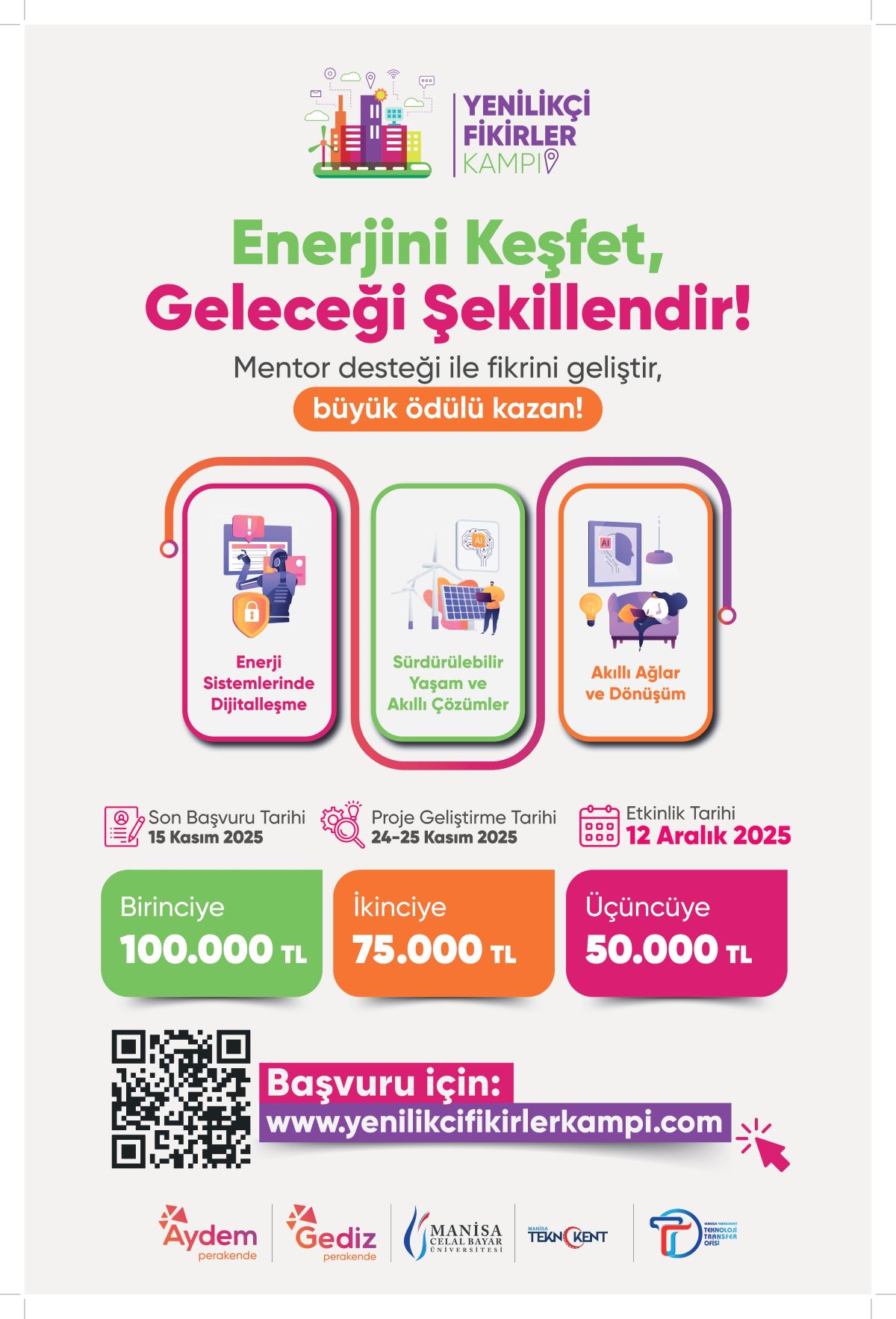 Aydem Perakende ve Manisa Celal Bayar Üniversitesi iş birliğiyle, Manisa Teknokent ve Teknoloji Transfer Ofisi katkılarıyla düzenlenen "Yenilikçi Fikirler Kampı" başvuruları başlamıştır. Etkinlik; Enerji Sistemlerinde Dijitalleşme, Sürdürülebilir Yaşam ve Akıllı Çözümler, Akıllı Ağlar ve Dönüşüm temalarında gerçekleştirilecek olup; katılımcılar mentor desteğiyle fikirlerini geliştirme fırsatı bulurken dereceye giren projeler de çeşitli ödüllerle desteklenecektir.