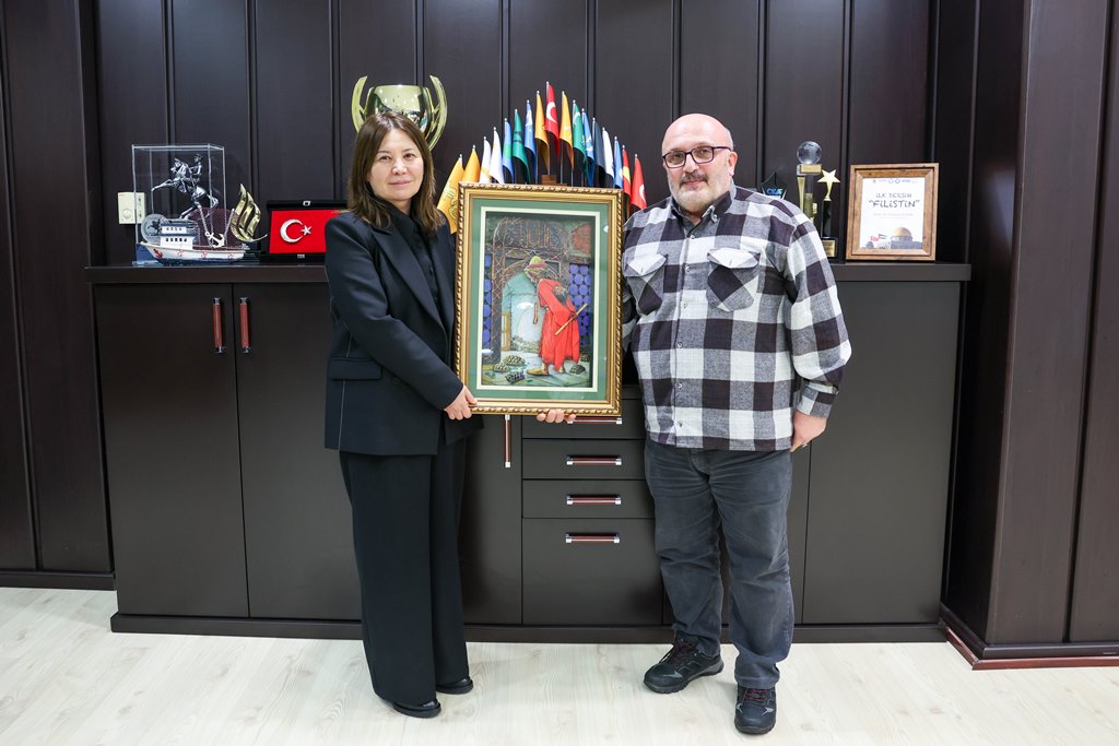 Ondokuz Mayıs Üniversitesi (OMÜ) Arapça Dil Merkezi (ADİM) Müdürü Doç. Dr. Hasan Selim Kıroğlu, OMÜ Rektörü Prof. Dr. Fatma Aydın’ı makamında ziyaret ederek Osman Hamdi Bey’in ünlü eseri “Kaplumbağa Terbiyecisi”ni hediye etti.